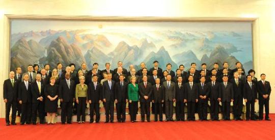 5月24日,為期兩天的第二輪中美戰略與經濟對話在北京人民大會堂舉行開幕式。這是開幕式前,王岐山、戴秉國和克林頓、蓋特納及雙方代表團主要成員集體合影。新華社記者饒愛民攝