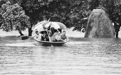 實驗中學內一片汪洋,很多綠化樹只能見到樹冠,宣傳欄只露出水面半截。因皮劃艇和沖鋒舟不夠,救援人員只能帶領學生們分批撤離。直到17時左右,學生才轉移完畢。