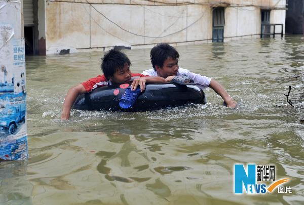 2010年6月2日,在廣西忻城縣北更鄉,居民在街道上乘“船”出行。攝影:新華社記者 周華