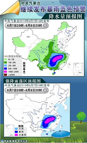 中央氣象臺6月7日18時繼續發布暴雨藍色預警: