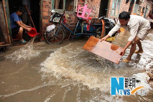 6月15日,在南寧市廣西醫科大學第二附屬醫院附近的居民區,居民在屋前排水。當日,廣西南寧市遭遇暴雨襲擊,氣象部門發布暴雨紅色預警信號,市區部分地段嚴重內澇,市郊一些農用設施被毀。新華社發(唐輝吉 攝)