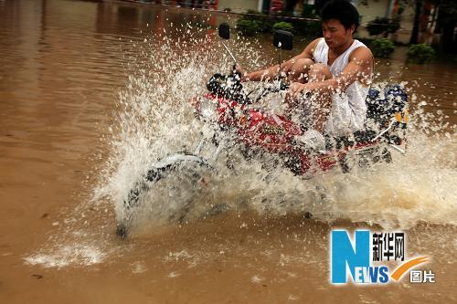 6月15日,南寧市一位男子騎著摩托涉水而行。當日,廣西南寧市遭遇暴雨襲擊,氣象部門發布暴雨紅色預警信號,市區部分地段嚴重內澇,市郊一些農用設施被毀。新華社發(唐輝吉 攝)