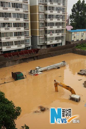 6月15日,南寧市某小區工地的貨車和大型工程機械浸泡在水中。當日,廣西南寧市遭遇暴雨襲擊,氣象部門發布暴雨紅色預警信號,市區部分地段嚴重內澇,市郊一些農用設施被毀。新華社發(唐輝吉 攝)