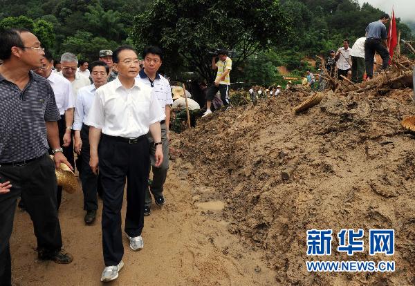 6月19日至20日,中共中央政治局常委、國務(wù)院總理溫家寶來到廣西梧州市,實(shí)地察看汛情、災(zāi)情,慰問奮戰(zhàn)在抗洪救災(zāi)一線的干部群眾,主持召開會議,部署防汛抗洪救災(zāi)工作。這是6月20日,溫家寶總理冒雨來到大山深處的蒼梧縣沙頭鎮(zhèn)雙尚村杉木坪自然村,察看因山體滑坡、泥石流造成的災(zāi)情。新華社記者李濤攝