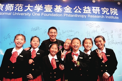 李連杰與孩子們在簽名板前合影留念。記者王磊攝