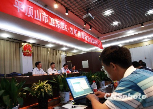 6月21日下午,由河南平頂山副市長李建偉等出席的新聞發布會上公布,決定免去對“6·21礦難”負有主要領導責任的衛東區區委委員、常委、副書記云建軍的職務;同時免去的還有衛東區委委員、常委、統戰部部長余艷卿;副區長潘震;區工會主席趙建國的職務。待事故調查結束后,根據責任認定情況再做進一步處理。 中新社發 王中舉 攝