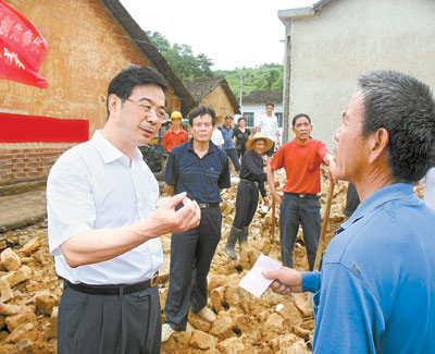 在一處廢墟上,村里的黨員干部正帶領村民們幫助倒房戶清理倒塌的房屋。周強走到大伙中間,同大家詳細交談,充分肯定農村基層黨支部和廣大黨員在抗洪搶險和災后重建中發揮的突出作用,同大家一道商量如何帶領受災群眾,盡快開展災后重建、救災補損。一位老支書說,村里水利基礎設施在洪水中損毀嚴重,這一塊應該是災后重建的重點。周強立刻接過話頭說,我們想到一塊了。