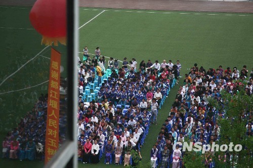 7月1日,來自玉樹藏族自治州民族中學的1200余名師生在都江堰八一聚源高級中學舉行開學典禮,并正式復課,這群來自玉樹災區首批異地復課的師生將在這里度過至少兩年的學習生活。圖為開學典禮儀式現場。 中新社發 張浪 攝
