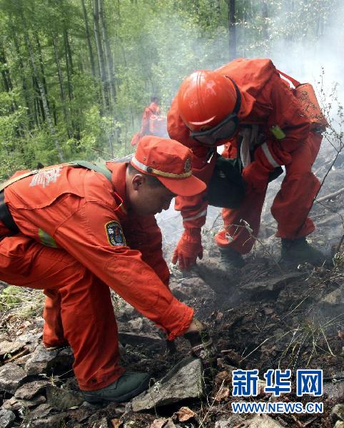 7月2日,武警黑龍江省森林總隊官兵在剛剛撲滅的火點進行徹底清理,防止復燃。新華社發