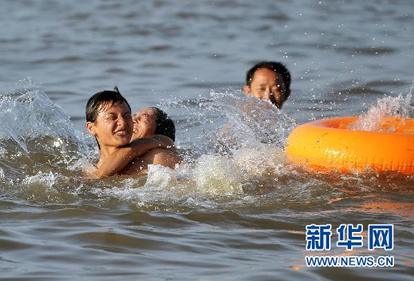 7月6日,市民在海口市西秀海灘享受海水的清涼。當日,海南省氣象臺繼續發布高溫橙色預警信號,海口、瓊海等10個市縣最高氣溫達37攝氏度以上,這是7月份以來海南省的第6個高溫天氣。新華社記者 郭程 攝