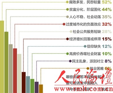 “腐敗多發,民怨較重”(占52%),“貧富分化,階層固化”(占44%)分別排在第一位和第二位