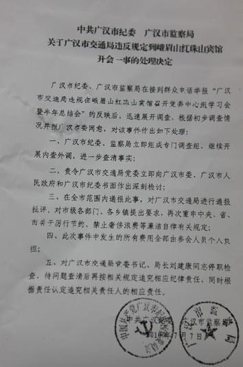 6日新聞報(bào)道了四川廣漢市交通局受三家公司邀請(qǐng),到峨眉山五星級(jí)酒店紅珠山賓館開會(huì),花費(fèi)3萬多元,交通局長停職檢查。
