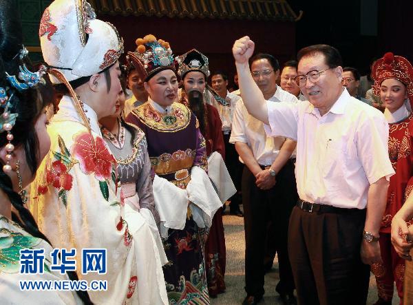 7月11日,首屆全國民營藝術(shù)院團(tuán)優(yōu)秀劇目展演在北京落下帷幕,中共中央政治局常委李長春觀看閉幕演出。這是演出結(jié)束后李長春與閉幕演出古裝越劇《狀元未了情》演員親切交談。新華社記者龐興雷攝