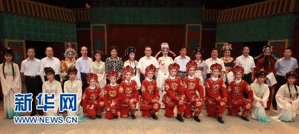 7月11日,首屆全國民營藝術(shù)院團(tuán)優(yōu)秀劇目展演在北京落下帷幕,中共中央政治局常委李長春觀看閉幕演出。這是李長春等上臺與閉幕演出古裝越劇《狀元未了情》演員合影。新華社記者龐興雷攝