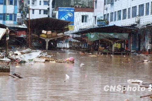 2010年7月10日11時左右暴雨再次襲擊重慶市萬州區分水鎮,場鎮農貿市場、小學、老林口農貿市場等局部地區洪水高峰時期深達1.5米左右。中新社發 趙俊超 攝