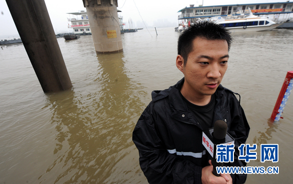 7月13日,一名記者在武漢關水文站前作現場報道。當日,長江武漢關水位上漲26.15米,超設防1.15米。受持續強降雨影響,長江流域多處發生超警戒洪水,中下游干流各站水位繼續上漲。新華社記者 余國慶 攝