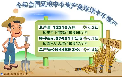 今年以來,中國氣候異常,災害嚴重,農業發展面臨巨大壓力。在嚴峻的形勢下,各級農業部門通過加大農業生產扶持力度、強化防災減災和科技支撐等措施,實現夏糧播種面積繼續增加,冬小麥畝產達到321.1公斤,比上年增加0.2公斤,全國11個夏糧主產省(區)均有不同程度增產,小麥優質率提高4.3個百分點。