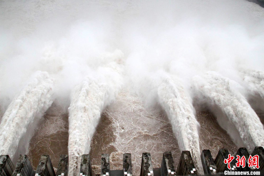 上午9時許,記者在三峽壩頂看到,9個深孔泄洪,巨大的白色水柱如虹如龍,在壩頂能感覺到水的強大沖擊力,泄洪閘前霧氣騰騰,洪水如脫韁野馬,飛瀉而出,發出如雷鳴般的巨響,翻起的滾滾白浪洶涌的拍打著壩下的江堤,在三峽大壩左右岸電站廠房內26臺發電機組全部開啟運轉,電能源源不斷送往中國各地。
