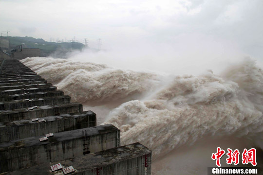 資料圖:7月20日上午,建庫以來最大洪峰抵達三峽大壩。 圖為大壩瀉洪。 劉良偉、郭曉瑩、上官純青 攝