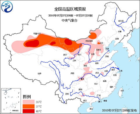 預(yù)計(jì),今天白天,北京南部、河北中西部、山西大部、陜西東部、寧夏北部、重慶大部、湖北西北部和東南部、廣西中部等地有35℃以上的高溫天氣,局地最高氣溫可達(dá)37~38℃;內(nèi)蒙古中西部、甘肅中西部、新疆吐魯番盆地及南疆盆地大部等地將有35~37℃的高溫天氣,局部地區(qū)最高氣溫可達(dá)40℃以上。