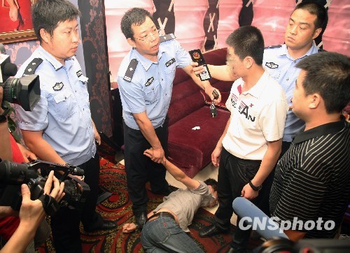 7月14日晚至15日凌晨,河北省石家莊市公安局調(diào)集警力,分組在火車(chē)站、長(zhǎng)途客運(yùn)站周邊地區(qū)及電子游藝廳、按摩店、KTV等娛樂(lè)場(chǎng)所進(jìn)行隨機(jī)突擊清查,嚴(yán)厲打擊色情接站和賣(mài)淫嫖娼等各類(lèi)違法活動(dòng)。在該市“新蘭桂坊”俱樂(lè)部,一名醉酒男子阻止警方檢查,并對(duì)隨行記者進(jìn)行打罵。圖為警察將涉嫌尋釁滋事男子制服。 中新社發(fā) 翟羽佳 從北京市公安機(jī)關(guān)關(guān)停“天上人間”開(kāi)始,借助公安部為期7個(gè)月的嚴(yán)打整治行動(dòng),一場(chǎng)掃黃風(fēng)暴席卷大江南北。