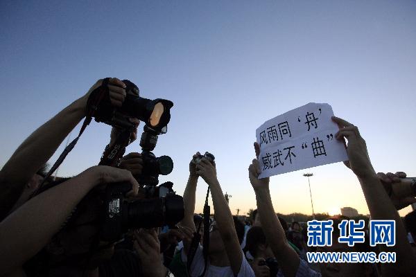 8月15日,北京天安門廣場降下半旗,向甘肅舟曲特大山洪泥石流遇難同胞志哀。這是一名男青年在天安門廣場手持寫有風雨同“舟” 威武不“曲”的紙張。 新華社記者 任正來 攝