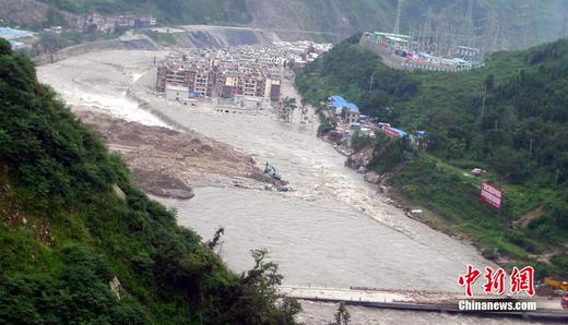 8月13日晚至14日凌晨,汶川縣境內突降暴雨,導致映秀、漩口、銀杏等多個鄉鎮發生滑坡、泥石流等災情,交通、通信、電力、供水中斷,岷江河段形成堰塞湖,將沿江的九寨溝環線、213國道淹沒,道路中斷。圖為8月15日拍攝的被洪水圍困的映秀新鎮全貌。中新社發 李杰 攝