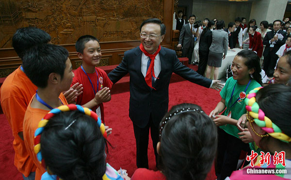 7月17日,在外交部橄欖廳,外交部長(zhǎng)楊潔篪勉勵(lì)玉樹震區(qū)小學(xué)生努力學(xué)習(xí)、重建家園。當(dāng)日,外交部舉辦第八次駐外使節(jié)任職宣誓儀式暨外交部“祖國(guó)在我心中”主題公眾開放日。中新社發(fā) 蘇丹 攝