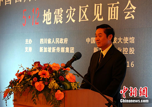 圖為中共四川省委書記劉奇葆在感謝新加坡社會各界援助5·12地震災(zāi)區(qū)見面會上致辭。