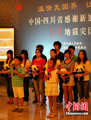 圖為來自地震災(zāi)四川綿竹中新友誼小學(xué)的兩位小朋友與新加坡四川籍留學(xué)生代表一起在見面會上演唱了《感恩的心》,表達(dá)感謝之情。鄒輝 攝