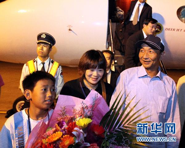 9月25日,詹其雄(前右)與前來迎接的妻兒團(tuán)聚。當(dāng)日4時(shí),被日方非法抓扣的中國漁船船長詹其雄乘中國政府包機(jī)安全返抵福州。新華社記者姜克紅攝