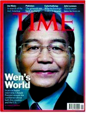 最新一期的美國《時代》周刊亞洲版的封面上,,這是溫家寶總理首次成為《時代》封面人物。該雜志在封面文章中呼吁美國政府客觀理性看待人民幣匯率問題,指出在匯率上做文章不會提升美國產品的競爭力。