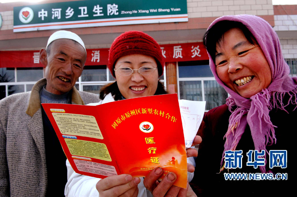 這是寧夏固原市原州區中河鄉衛生院醫生張玉蓮(中)在給村民介紹新型農村合作醫療證(2007年1月13日攝)。