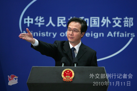 2010年11月11日,外交部發言人洪磊主持例行記者會。