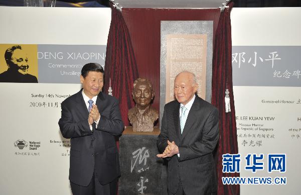 資料圖片:11月14日,正在新加坡訪問的國家副主席習近平與新加坡內閣資政李光耀共同出席在新加坡河畔舉行的鄧小平紀念碑揭幕儀式。新華社記者黃敬文攝