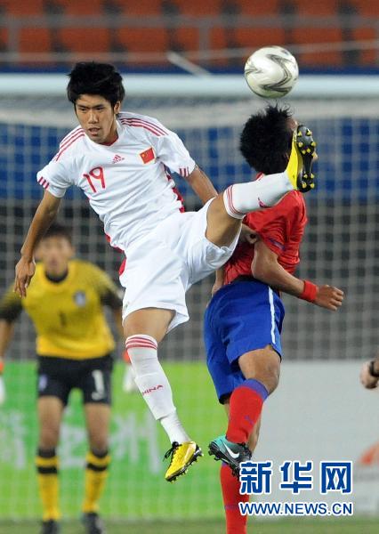 11月15日,中國隊球員呂文君(左)與對手在比賽中爭頂。當日,在廣州天河體育場舉行的第16屆亞運會男足八分之一決賽中,中國隊0比3負于韓國隊,遭到淘汰。新華社記者李勇攝