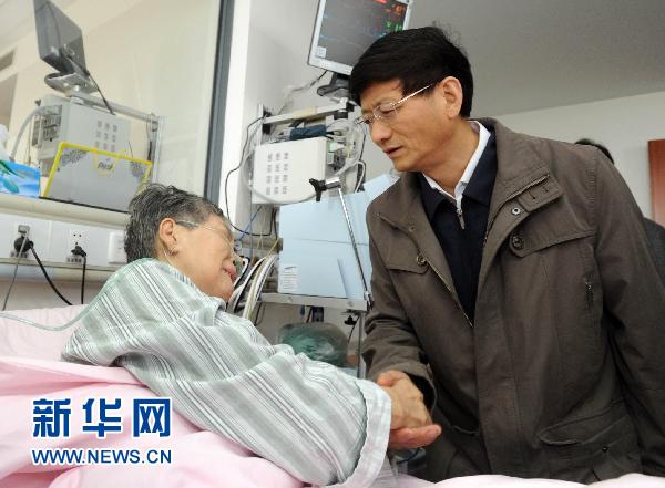 11月16日上午,受黨中央、國務院委托,正在上海指導“11·15”特別重大火災事故救援及善后工作的國務委員、公安部部長孟建柱專程看望慰問火災事故受傷人員和遇難者家屬。這是孟建柱在上海市華東醫院看望火災事故受傷人員。 新華社記者 金良快攝