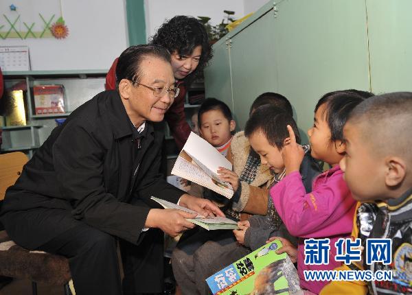 資料圖片:11月2日,中共中央政治局常委、國(guó)務(wù)院總理溫家寶來(lái)到北京兩所幼兒園就發(fā)展學(xué)前教育問(wèn)題進(jìn)行調(diào)研,并與教師和家長(zhǎng)們座談。這是溫家寶在北京西城區(qū)西柳樹(shù)井幼兒園與孩子們交流。 新華社記者黃敬文攝