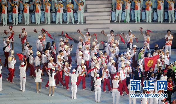 各代表團在閉幕式上入場 11月27日,吉爾吉斯斯坦代表團在閉幕式上入場。當日,第16屆亞運會閉幕式在廣州市海心沙島舉行。 新華社記者楊磊攝