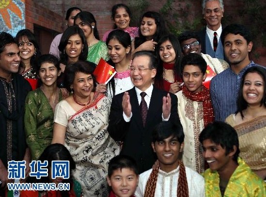 在中印商務合作峰會發表演講后,16時30分許,溫家寶總理來到了泰戈爾國際學校。校園里,許多學生身著民族服裝,揮舞著中印兩國國旗,用漢語歡迎溫總理的到來。