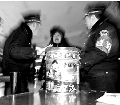 前天,在北京站,一名旅客攜帶易燃的乳膠漆被警方查獲。 記者 蒲東峰 攝