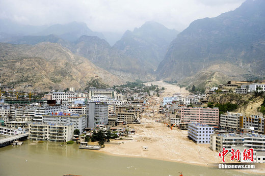 資料圖:2010年8月7日夜至8日凌晨,甘肅甘南藏族自治州舟曲縣突發特大泥石流,造成重大人員傷亡。圖為8月10日,從白龍江南岸的高處拍攝的甘肅舟曲災區全景。中新社發 廖攀 攝