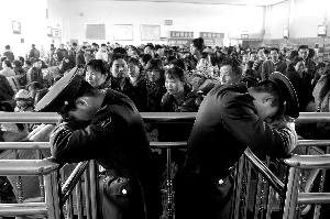 前日,春運(yùn)第三天,浙江嘉興火車站,負(fù)責(zé)執(zhí)勤的武警戰(zhàn)士利用檢票間隙趴在護(hù)欄上打盹小憩。車站說武警體力消耗非常大。嘉興日報(bào)
