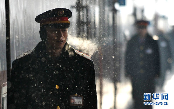 1月19日,在哈爾濱火車站的站臺上,列車員李福生在雪中堅(jiān)守崗位。當(dāng)日,2011年鐵路春運(yùn)正式啟動(dòng)。在哈爾濱火車站,許許多多的鐵路工作人員在寒風(fēng)中堅(jiān)守職責(zé),為乘客送去溫暖,為春運(yùn)提供保障。新華社記者王建威攝
