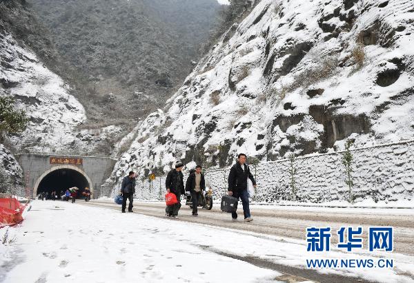 資料圖片:1月19日,返鄉民工帶著行李在319國道上徒步行走。當日是全國春運首日,渝東南地區受到嚴重的冰雪天氣影響,部分客運車輛停運。新華社記者 陳誠 攝