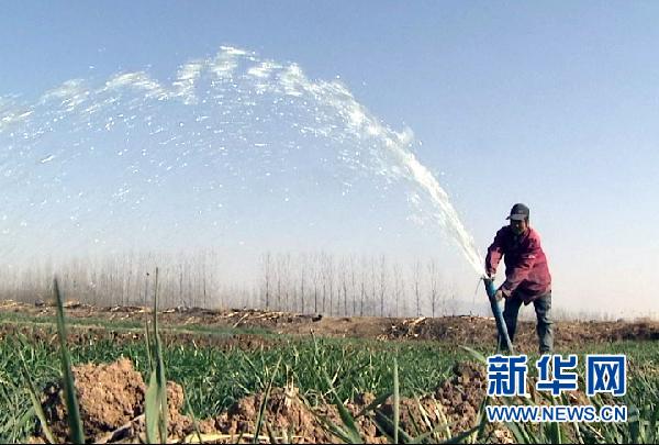 山東滕州市級索鎮千佛閣村村民王次玉在給麥田灌溉。據山東省防汛抗旱指揮部辦公室22日通報,全省旱情仍在持續加劇,總體已達60年一遇標準,抗旱形勢日趨嚴峻,人畜臨時飲水出現困難。新華社記者范長國攝