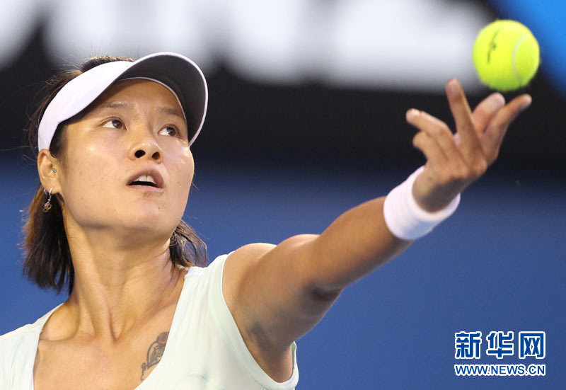 1月29日,中國選手李娜在比賽中發球。當日,李娜在澳網女單決賽中以1:2不敵比利時名將克里斯特爾斯,獲得澳網亞軍,這也是亞洲職業球員在大滿貫單打比賽中的最好成績。新華社記者孟永民攝