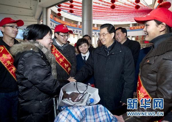 2月1日和2日,農(nóng)歷臘月二十九和臘月三十,中共中央總書記、國家主席、中央軍委主席胡錦濤在河北省保定市同基層干部群眾共迎新春。這是胡錦濤在保定市長途汽車客運(yùn)中心站親切看望慰問青年志愿者和候車旅客。新華社記者李學(xué)仁攝