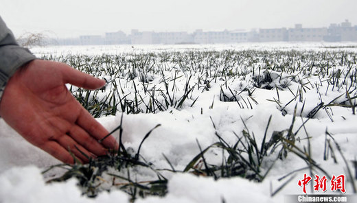 2月10日,河北省氣象局稱:為緩解50年一遇的旱情,該省已在石家莊、保定、邢臺、邯鄲、承德、廊坊、張家口等地共發(fā)射火箭彈231枚、炮彈40發(fā)、煙條155條進行人工增雪作業(yè)。據(jù)悉,本次降雪對增加土壤墑情、降低森林草原火險等級較有利,在一定程度上為干旱的麥苗“解渴”。圖為石家莊一麥田積雪已達(dá)4厘米左右。 中新社記者 翟羽佳 攝