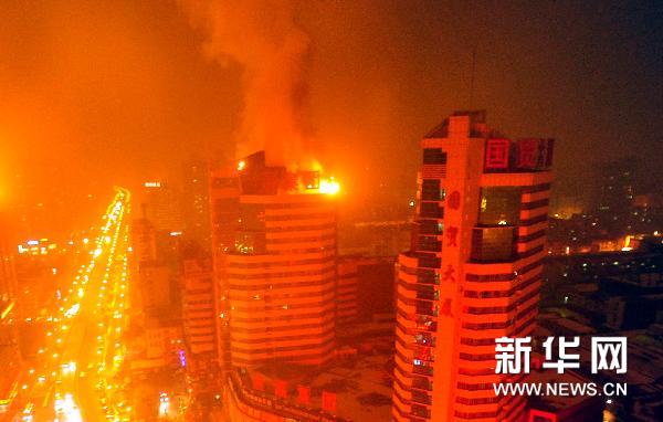 21日晚23時40分,烏魯木齊長江路約20余層的國貿大廈B座商貿樓頂層可見明火及濃煙。21日晚23時許,烏魯木齊長江路約20余層的國貿大廈B座商貿樓失火。22日0時,記者在現場看到,交警部門已對長江路實施交通管制,約有20余輛消防車正在緊張滅火中。具體人員傷亡情況尚在調查中。新華社記者 江文耀 攝